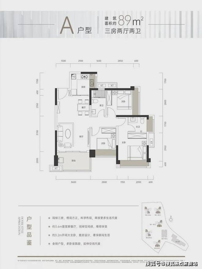 89㎡的3房2厅2卫,设计的是竖厅格局,动静分区,客厅3.6米开间,3个卧室分别为3.2/2.8/2.8米的宽度,U型厨房,得房率:88.55%(包含赠送),阳台2米进深,有朝南、朝西或朝东向。