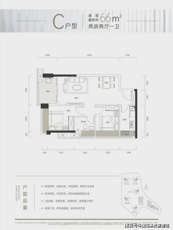 66㎡的2房2厅1卫,设计的是竖厅格局,客餐厅一体化,客厅3米开间,2个卧室分别为2.8/2.55米的宽度,L型厨房,得房率:89%(包含赠送),阳台2米进深,有朝西或朝东向。