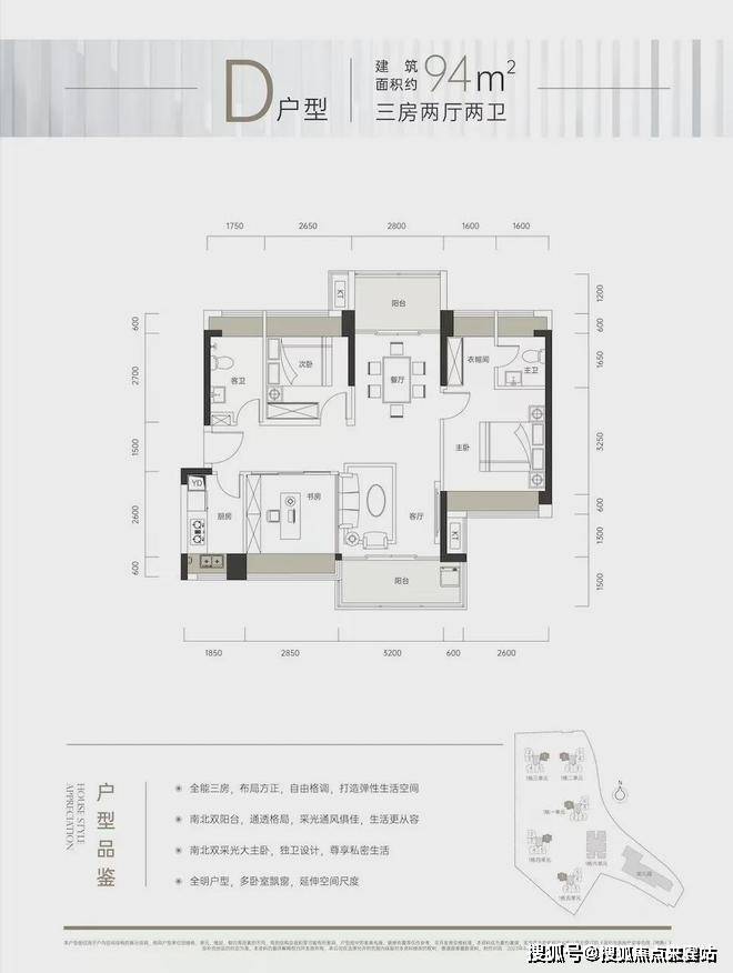 94㎡的3房2厅2卫,设计的是竖厅南北通透格局,双阳台设计,客厅3.2米开间,3个卧室分别为3.2/2.85/2.65米的宽度,主卧大套房设计,L型厨房,得房率:92.09%(包含赠送),大阳台3.8米宽,主朝南向。