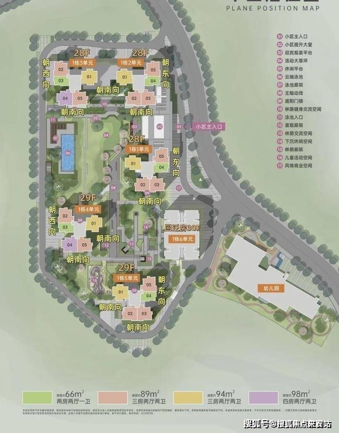 建面约66-98㎡二至四房,总占地面积约2.54万㎡,总建筑面积约11.1万㎡,计容建筑面积约9.3万㎡,容积率3.2,绿化率40.13%,共由6栋28-30F住宅组成,其中1栋1/2/3单元商品房28F,1栋4/5单元商品房29F,1栋6单元回迁房30F,2栋为幼儿园。总规划932户,其中商品房660户,全部都是2梯5户设计,2024年底交房。