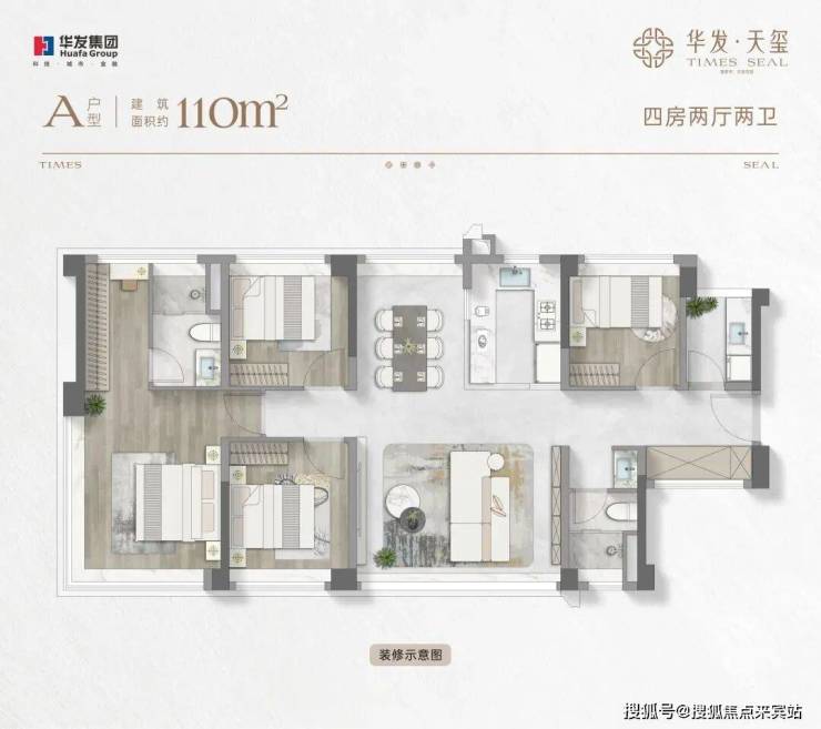 约110-114㎡四房两厅两卫:约16米通风面,户户是端户;约28㎡行政级端卧套房,270°景观视野,360°环统式采光