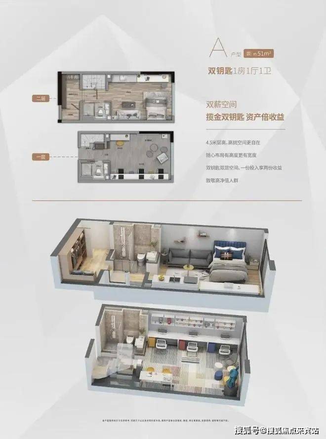 公寓部分规划了3栋21层高楼栋,4梯16户loft设计,共推出288套房源,户型层高4.5米,为精装交付。