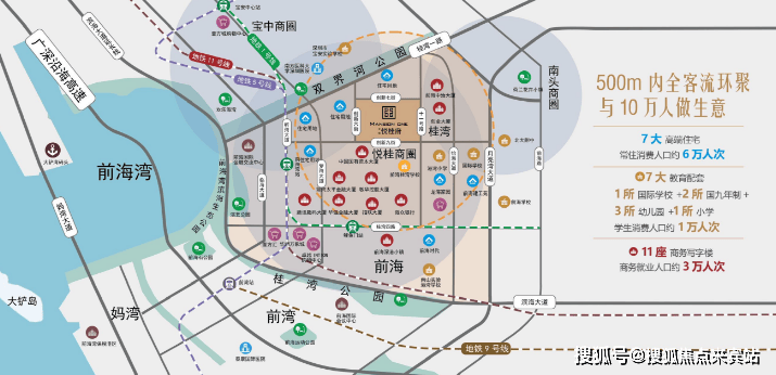 500米内涵盖11个顶级商办,7个高端住宅,7大教育配套,约10万人常驻消费人口