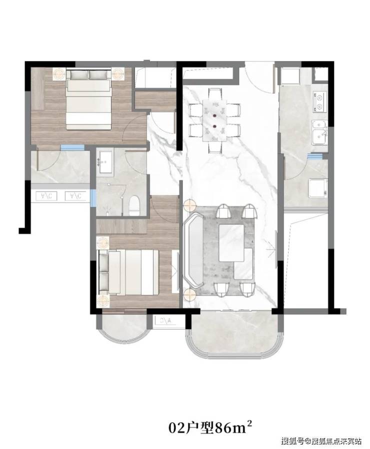 02户型:约86㎡,两房两厅一卫