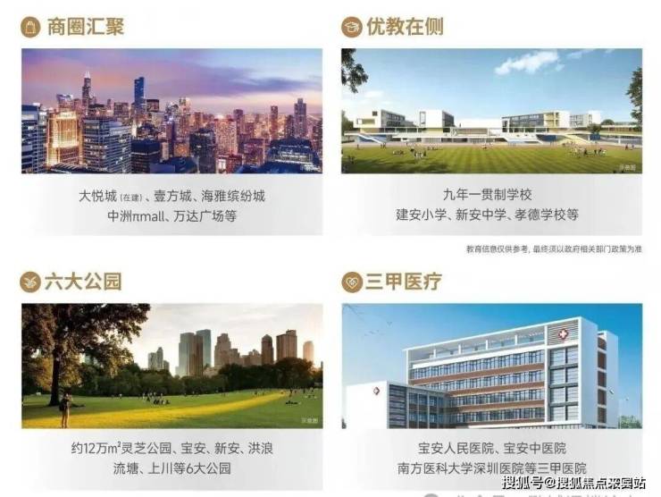 05.城芯醇熟配套 优教为邻/6大公园/三甲医疗 3公里全能配套以大悦城为核芯,形成3公里优质生活圈,集产业、商业、优教、公园、医疗等丰富功能于一体。项目自带九年一贯制学校、幼儿园,建安小学、新安中学、孝德学校等优教环伺;下楼即享约12万㎡灵芝公园,深圳西部最大的市政公园-宝安公园、新安、洪浪、流塘、上川等6大公园环绕。宝安人民医院、宝安中医院、南方医科大学深圳医院等三甲医院护航健康。