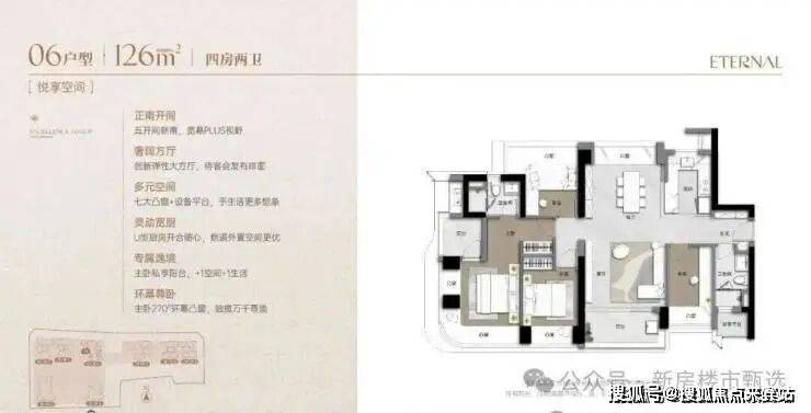 126m²的4房2厅2卫,设计的是竖厅南北通透格局,客厅3.9米开间,客餐厅分离化设计,五开间朝南,主卧套房270°环幕凸窗+私享阳台,七大凸窗+设备平台,分别做到了主卧20.23㎡/次卧9.92㎡/次卧9.3㎡/次卧8.77㎡(实测面积,去掉墙体),U型厨房,卫生间干湿分离,得房率超90%(包含赠送),正南朝向,看皇岗公园。