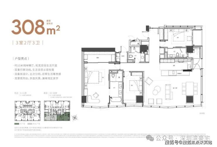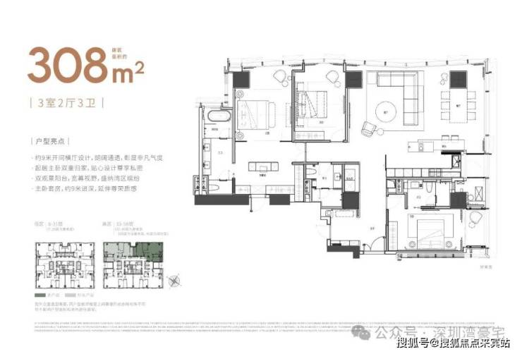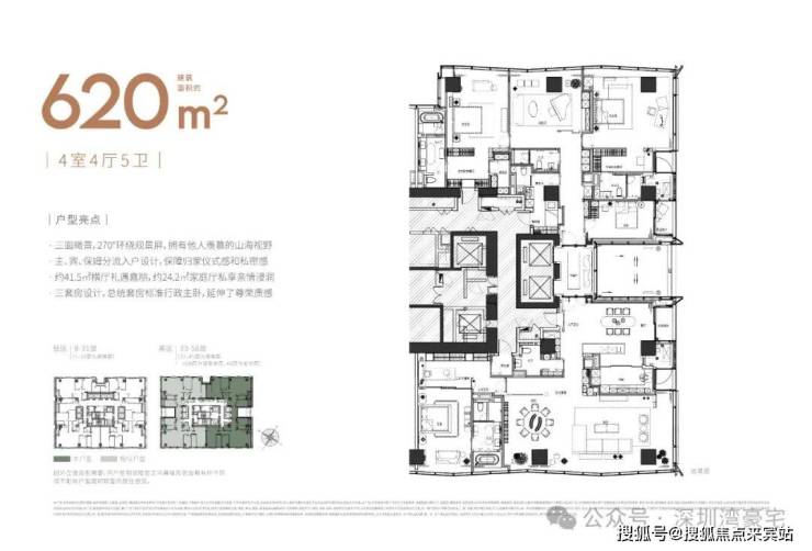 大平面大尺度定位,层高约3.6米,横厅设计确保最大化观景面,全户型纵享环幕视野。项目打造主力建面约215-415㎡纯粹品质公寓共191席,顶层为建面约1270㎡公寓产品。