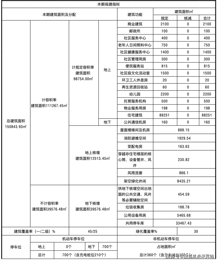总建筑面积150843. 93㎡,住宅建筑88251㎡,商业建筑2100㎡,还有社区服务中心、老年人日间照料中心、社区健康服务中心、社区管理用房、便民服务站、幼儿园、托育服务机构等配套。停车场700个(全部地下)。