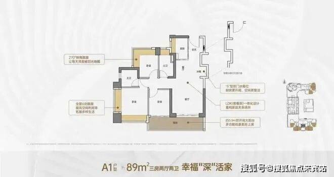竖厅格局,客厅3.5米开间,LDKB一体化,S墙设计预留冰箱卡槽位,客厅连接次卧出5.9米长的大阳台,主卧双面飘窗,次卧270°转角飘窗,全屋6面飘窗,U型厨房,卫生间干湿分离。