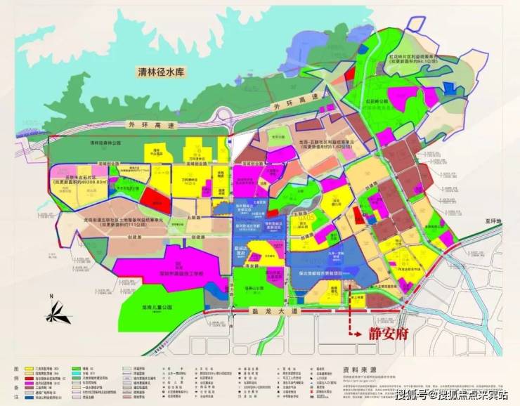 静安府于龙岗街道玉岭路与楼岭路(规划路)交界处。总建筑面积13.8万㎡,规划建设5栋住宅,总户数1050户其中商品房920户,保障房130户。套内面积≤90㎡共990户,占比约94%。小区配建一所1600㎡幼儿园。