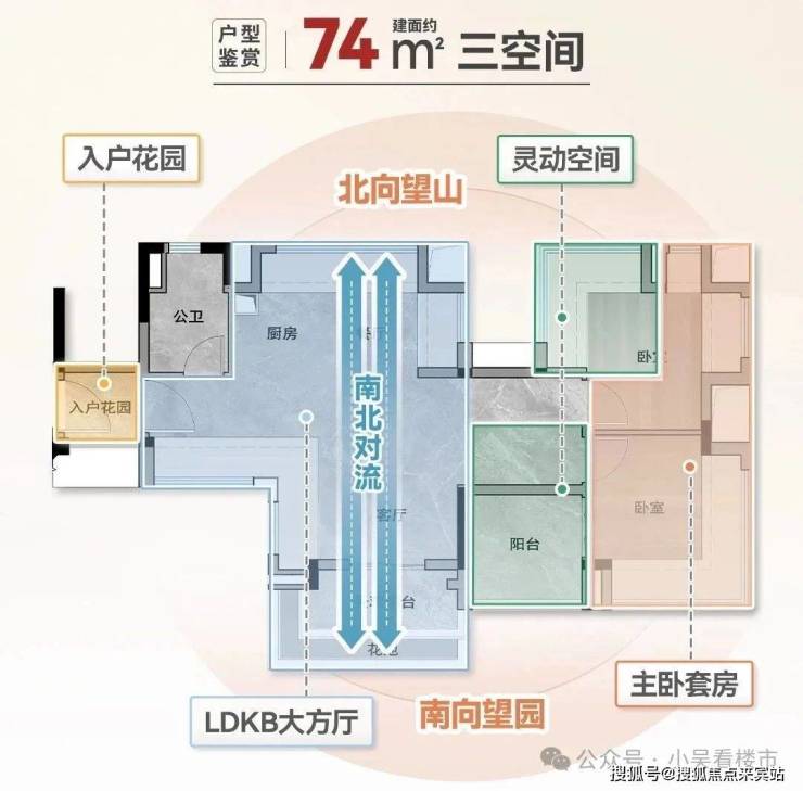 建面74平三房两卫,带有入户花园,客厅做到南北对流,LDKB一体化设计,带豪华主套,望中心园林,总价230-250万左右。