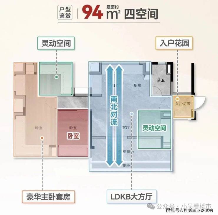 建面94平四房两卫,南北对流设计,LDKB大方厅设计,客厅约4米开间,超长的景观阳台,餐厅可以望到山景,总价310-350万左右。