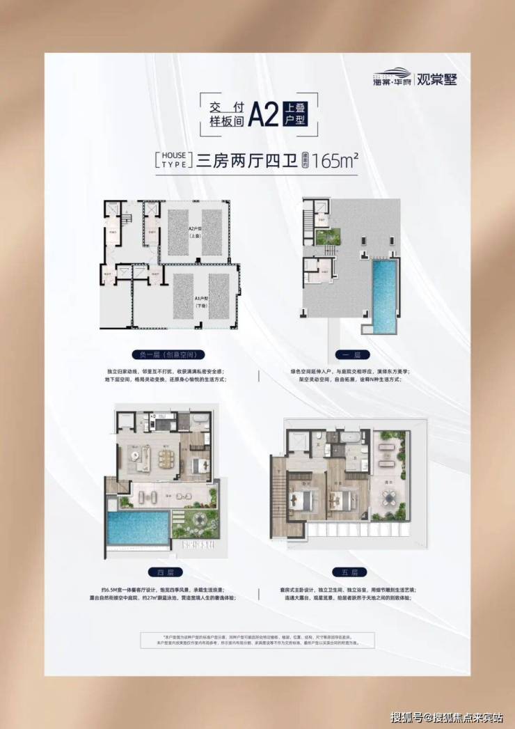 上叠建筑面积165㎡,3F2T3W,赠送164平米(含地下车库62平米,4楼庭院面积83平米以及5楼阳台28平米,共4层(负一层车库首层➕4层➕5层),室内层高3.3米,架空层以及地下车库挑高3.9米。