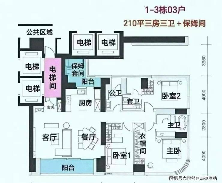 分布在C栋,4梯3户,层高3.3米,专梯入户。作为起步户型,设计为三房而非四房,保证圈层纯粹。总价预计3500万+,但需注意部分户型有遮挡。