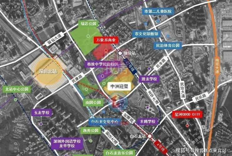 项目原中洲黄金台,定名为中洲迎玺花园,位于龙华民治街道,西北毗邻中海珑悦理家园,东北毗邻超核中心润府。