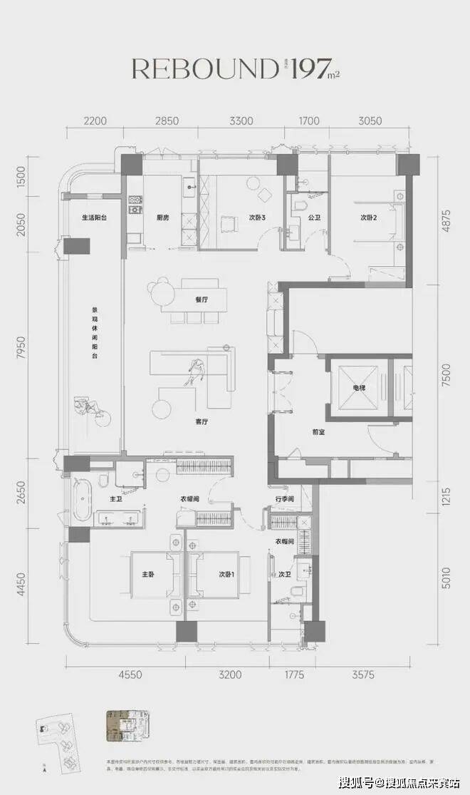 197㎡的4房2厅3卫,设计的是竖厅双龙抱珠格局,一梯一户,专梯入户设计,赠送私用电梯厅,客餐厅7.95米开间,LDKB一体化设计,四开间朝南,分别做到了主卧28.2㎡/次卧套间18.3㎡/次卧14.87㎡/次卧11.71㎡(包含墙体飘窗),客厅连接餐厅出10米长的超大观景阳台约22平,U型厨房,卫生间干湿分离,得房率约100%(包含赠送),西南朝向。