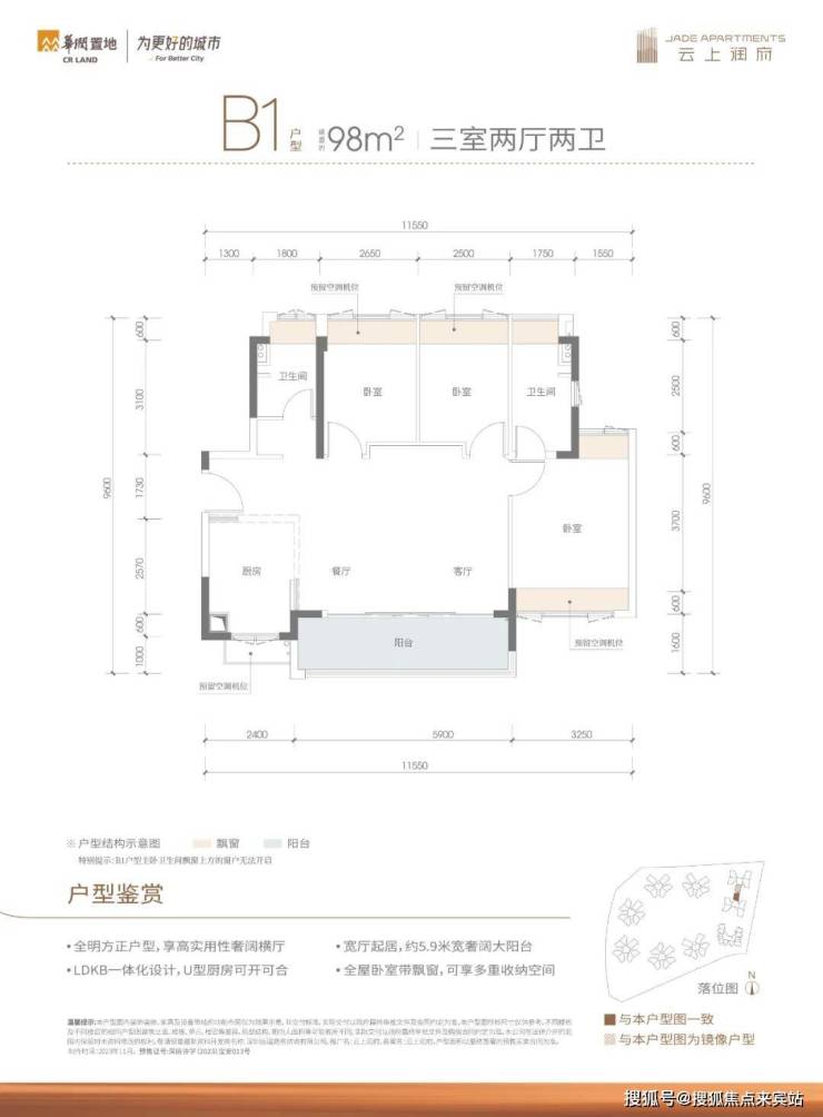 98㎡的3房2厅2卫,B1户型,设计的是横厅南北通透格局,客餐厅5.9米开间,LDKB一体化,3个卧室分别做到了3.25米/2.65米/2.5米的宽度,U型厨房,公卫三段式分离设计,得房率81.23%(不含赠送),阳台主朝东南向。