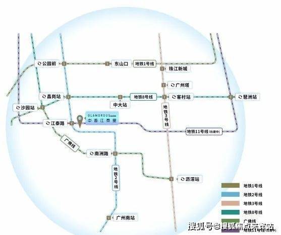 中海江泰里位于江南西板块,再精确一点来说是在海珠西板块,距离2号线江泰路约116米,是真正意义上的地铁上盖盘。从江泰路1个站即可换乘8号线,不到半个小时就能到达新港东,交通十分便捷。