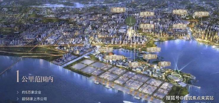 4.前海湾中轴之核,湾区超强总部经济区:项目1公里范围内约5万家高新企业,超60家上市公司,腾讯、前海人寿、VIVO总部等名企林立,资产超10亿企业约25家