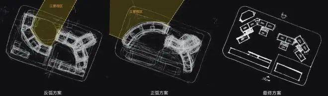 为充分考虑南向城市界面与北向珠江沿岸界面,经过建筑师多轮方案讨论及推敲,提出了环抱式规划方案。