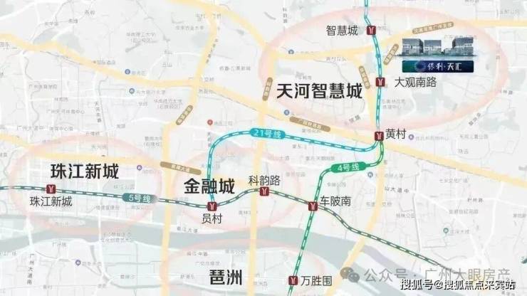 项目距离21号线大观南路站约1.2公里,步行大概需要15分钟,建议买个小电车接驳,一站换乘4号线去往金融城、琶洲,4站到员村换乘5号线直抵珠江新城。