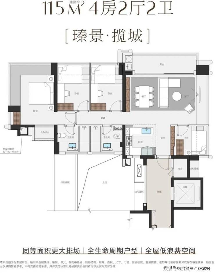 户型方面,主推建面115㎡-143㎡四房,户型使用率超100%,最大可达108%,最高赠送面积近44㎡。