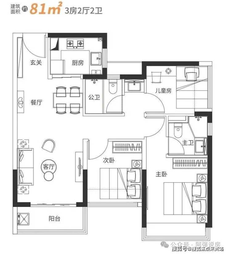 81㎡3房2卫(210万起)26-33层:采用经典竖厅设计,客餐厅一体化,开间3.2米,三开间朝南,部分楼层可以看山景,空间利用率高,三个房间的面积为:主卧13.3㎡,次卧7.83㎡-6.9㎡。得房率超87%。