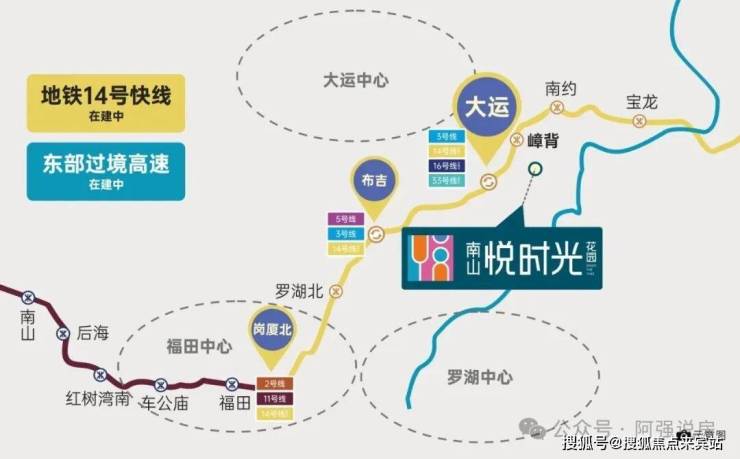 14号地铁线“南约站”距离约2公里,2站到大运,7站到布吉,8站到罗湖,10站到福田岗厦北35分钟。