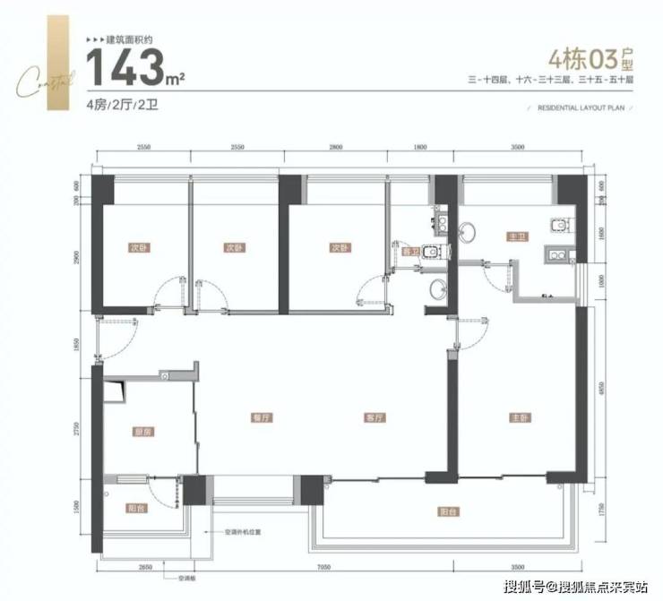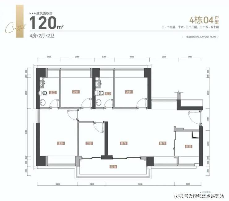 而约120㎡的横厅四房二卫户型设计得挺优秀,非常符合年轻人的口味。美中不足的是阳台连着主卧而不是餐厅,不够开阳。次卧看着足够大,厨房有小阳台加分,在这么多批「海岸城」项目中,这个户型也算是比较了得的一款。