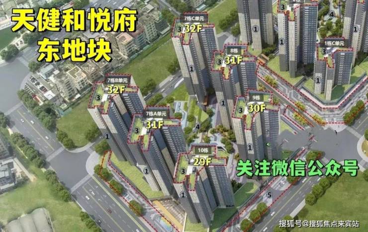 天健和悦府本次首推的是西地块,总占地面积约2.63万㎡,总建筑面积约18.43万㎡,计容建筑面积约13.56万㎡,容积率5,绿化率39.52%,共由7栋总高21-45层的住宅组成,其中1栋A座企业租赁住房33F,1栋B座商品房33F,1栋C座商品房21F,2栋住宅30F,3栋公租房31F,5栋商品房+公租房45F,6栋企业自持租赁住房33F,4栋是1所12班制幼儿园。