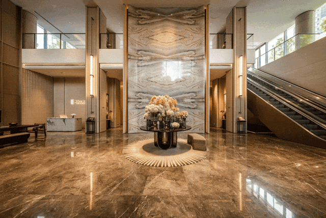 选材上极尽考究,如大堂主背景墙,特地选用意大利白金沙奢石整面铺就。