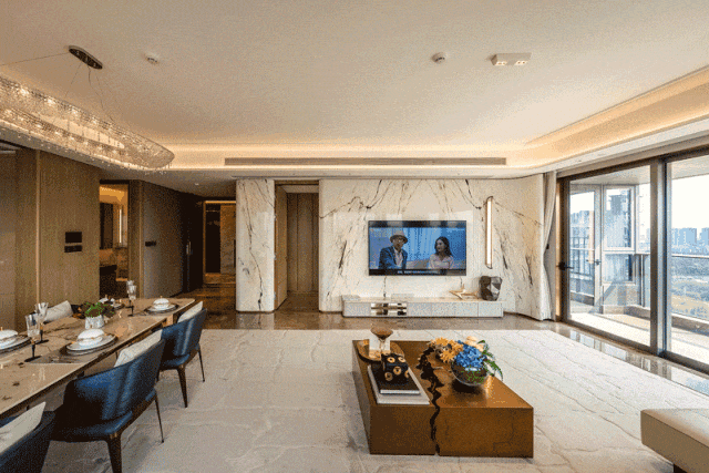 地面与背景墙均严选来自南美洲、欧洲等世界珍稀石材,用料成本达普通豪宅3倍以上,每一处肌理皆叙述着自然的瑰丽与时间的沉淀。