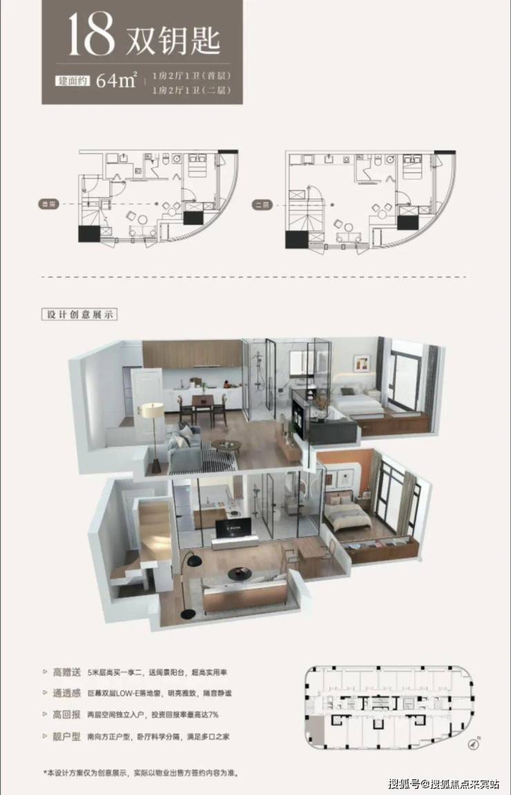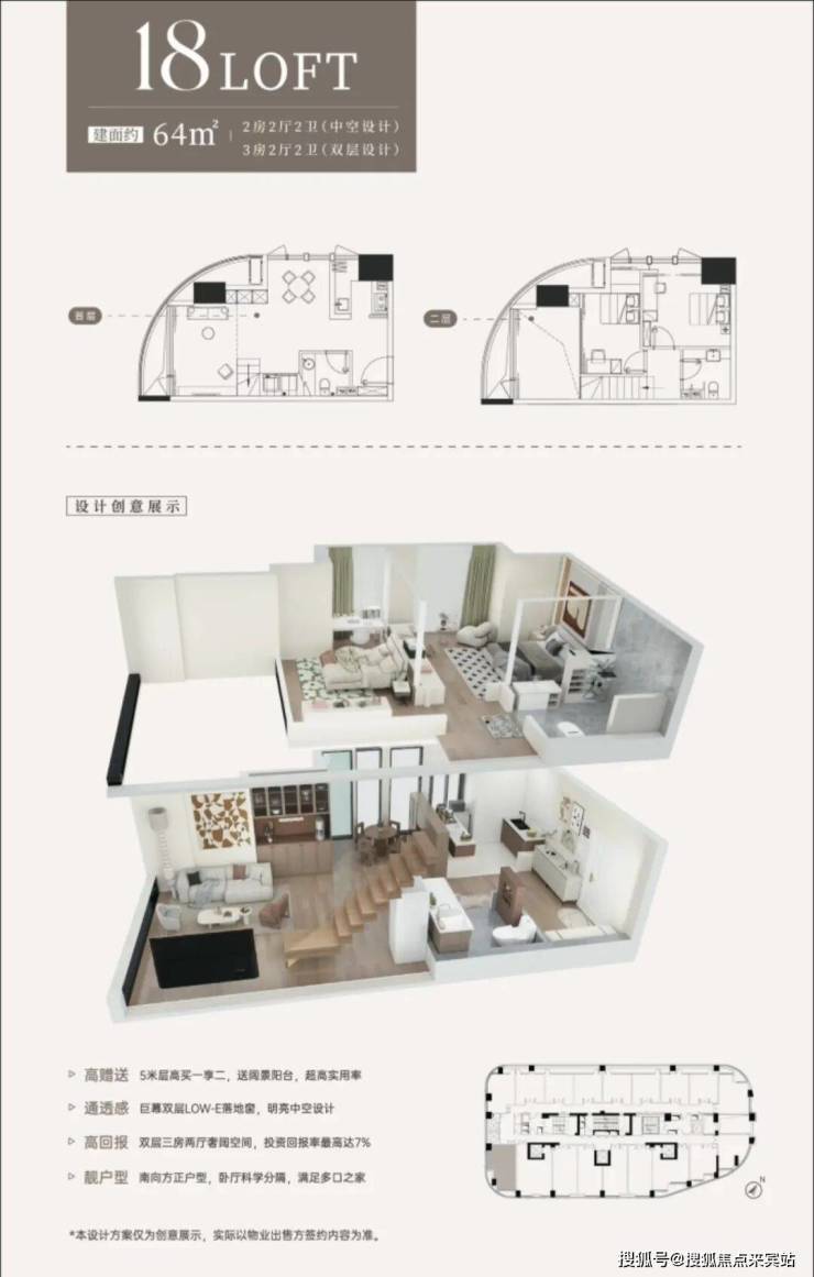 约64㎡,可设计为2+1房2厅2卫(中空设计3+1房2厅2卫(双层设计)。
