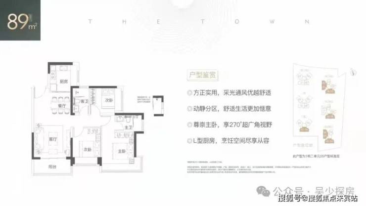 89㎡的3房2厅2卫,设计的是经典竖厅格局,客厅3.6米开间,LDKB一体化设计,动静分区,3个卧室分别做到了3.2米/2.7米/2.5米的宽度,主卧270°超广角视野,L型厨房,卫生间干湿分离,得房率:76.33%(不含赠送),有西北或西南朝向。