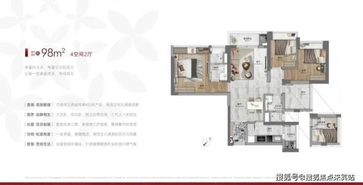 建面98平四房两卫,全屋智能化铺设,大主卧设计,双阳台,总价400-450万左右。