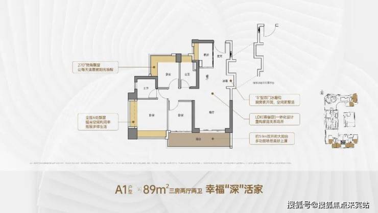 89㎡的3房2厅2卫,A2户型,设计的是竖厅格局,客厅3.5米开间,LDKB一体化,S墙设计预留冰箱卡槽位,客厅连接次卧出5.9米长的大阳台,次卧270度转角飘窗,U型厨房,卫生间干湿分离,阳台有朝西向、东向、南向。
