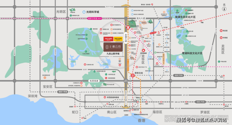 项目的18号线(规划中)/6号线南延线(规划中)设站九龙山地铁站(规划中),本项目与地铁4号线长湖站直线距离约2.7公里,为美好生活加速。主干道:临近龙澜大道、观光路等主干道,接驳福龙路、侨城东路北延通道,快速通达深圳各区。高速:临近深圳外环高速/珠三角环线高速/沈海高速等,便捷出行。