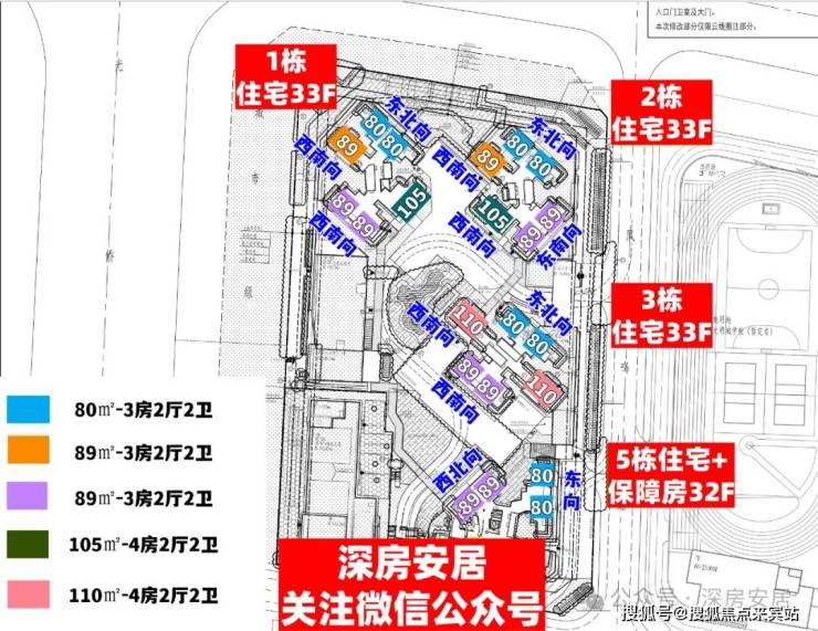 总占地面积约1.43万㎡,总建筑面积约11.49万㎡,计容建筑面积约7.91万㎡,容积率5.4,绿化率35.1%,共由4栋总高32-33F住宅组成,其中1/2/3栋商品房33F,5栋商品房+保障房32F,4栋是1所6班制幼儿园。
