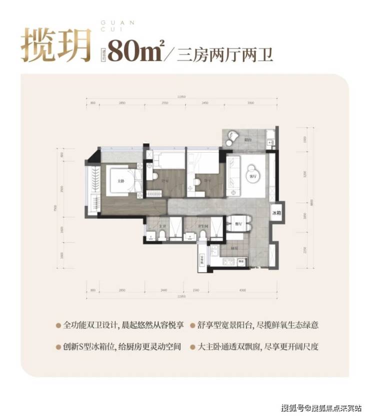 80㎡的3房2厅2卫,设计的是竖厅格局,客厅3.3米开间,LDKB一体化,S墙设计预留冰箱卡槽位,3个卧室分别做到了3.65米/2.55米/2.45米的宽度,L型厨房,卫生间干湿分离,有朝东北向或正东朝向。