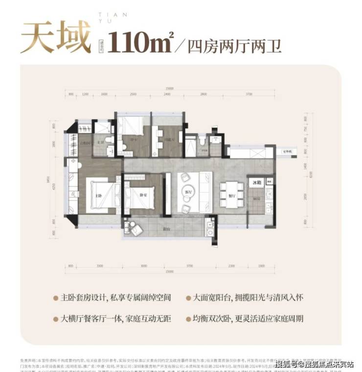 110㎡的4房2厅2卫,设计的是横厅南北通透格局,进门入户玄关,客餐厅6米开间,LDKB一体化,4个卧室分别做到了4.1米/3米/2.5米/2.4米的宽度,主卧套房设计,客厅连接次卧出6.7米长的大阳台,L型厨房,卫生间干湿分离,阳台主朝西南向。