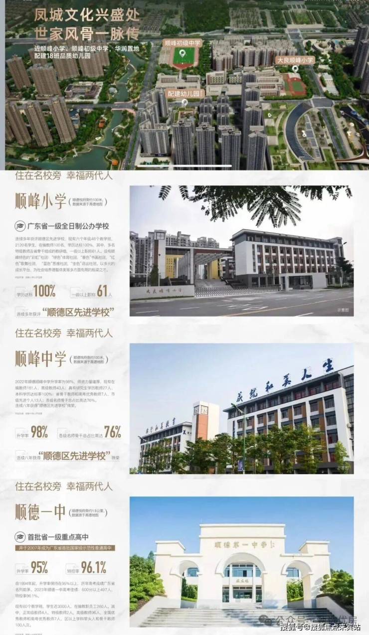 小区门口一路之隔即省一级公办名校顺峰幼儿园,顺峰小学和顺峰初级中学,附近还有大良实验小学,顺德本真未来小学,李兆基中学等;满足孩子3到18岁的全龄段优质教育。地铁一站即可到达顺德第一中学。
