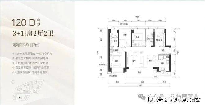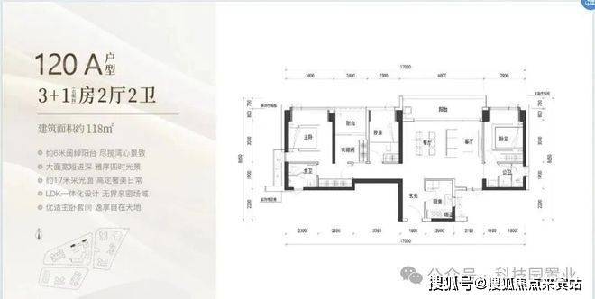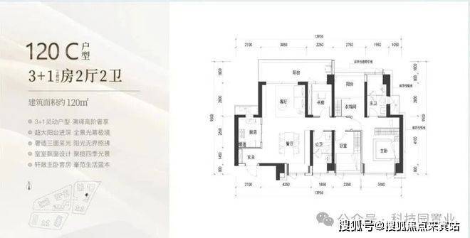 120㎡:客厅与卧室连通9.6㎡超大阳台,主卧带5.2㎡衣帽间,还有观景小阳台,主要为东南和西南朝向