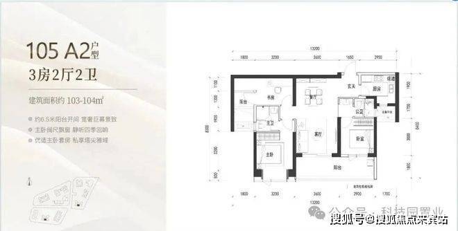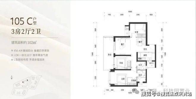 105㎡:竖厅格局,客厅与卧室连通超大阳台,LDK一体化设计,主卧室270度转角飘窗,看城市景观,主要朝向为西南和东南