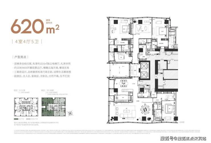 ◎ 大尺度空间 纵享环幕视野大平面大尺度定位,层高约3.6米,横厅设计确保奢阔观景面,全户型纵享环幕视野。项目打造建面约215-620㎡纯粹品质公寓,顶层为建面约1270㎡公寓产品。