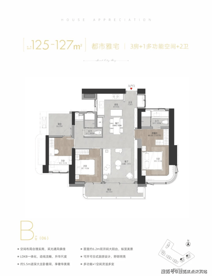 空间布局合理实用,采光通风俱佳LDKB一体化,动线流畅,尺度约5.5m进深大主卧套间,面宽约6.2m双开间大阳台,可开可合式厨房设计,明亮多功能+1空间灵活多变。