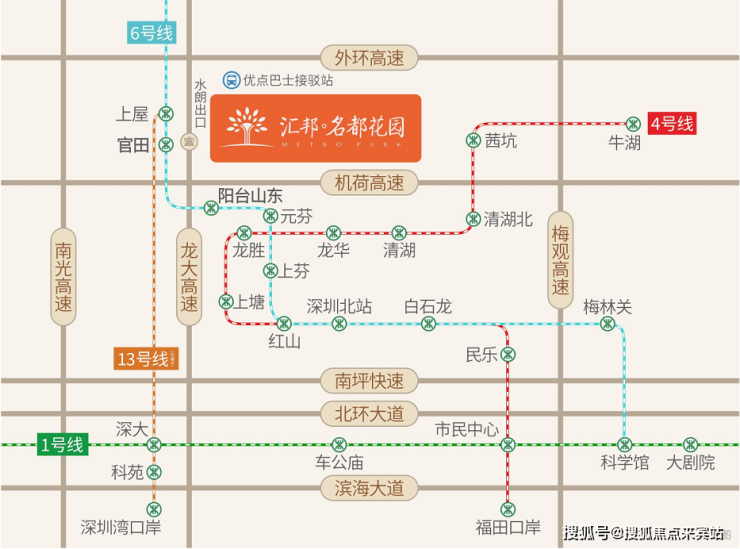 轨道交通方面,地铁6号线预计将于2020年5月全线通车,距离项目最近的站点是“官田站”,6号线一期是连接深圳北站和松岗的一条地铁线路,可与4号线换乘乘至福田中心区。另外地铁13号线(已规划)未来也将通过该片区。