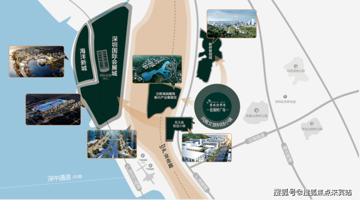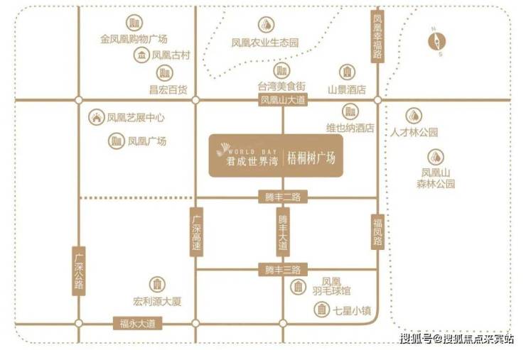 君成世界湾梧桐树广场位于深圳宝安福永凤凰山大道与福凤路交汇处西侧,为凤凰山麓56万㎡森尚超体,总占地69849.50 ㎡,集高端商务办公、国际公寓、旗舰商业、奢尚酒店、高配置学校于一体,独占人文与生态价值鳌头,空港会展双核辐射,聚合庞大客流,以封面超体之姿,造就湾区都会坐标,