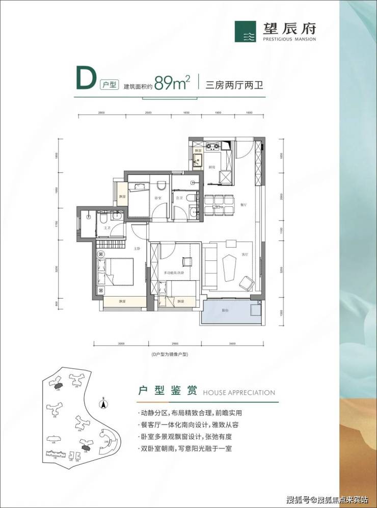 89㎡的3房2厅2卫,设计的是经典竖厅格局,客厅3.4米开间,餐客厅一体化,三开间朝南,3个卧室分别是3米/2.9米/2.5米的宽度,L型厨房, 得房率:78.38%(不含赠送),阳台朝东南或西南朝向,本次推出来的2栋朝东南向,看花园景观