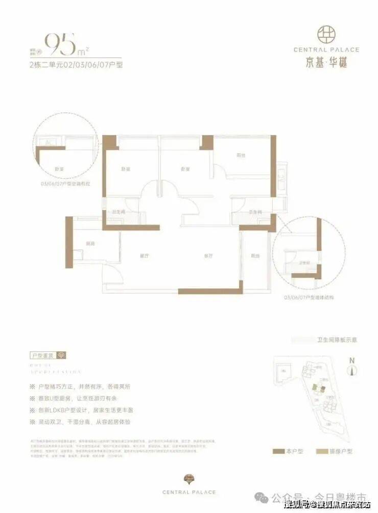 仅2栋2单元05户型才有,设计的是经典竖厅格局,LDKB一体化,动静分区,四开间朝南,U型厨房,卫生间干湿分离,得房率约73%(不含赠送),阳台西南朝向。