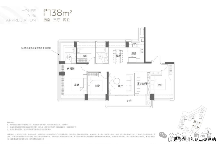 138㎡的4房2厅2卫:竖厅南北通透格局,专梯入户,客厅6.1米开间,LDKB一体化,全屋飘窗,4个卧室分别做到了3.9米/3.25米/2.9米/2.8米的宽度,主卧加1个次卧270°全景飘窗,客厅出6.1米长的大阳台,U型厨房,得房率约95-97%(包含赠送),阳台主朝西南向。138平米户型分布在3栋1单元、3栋2单元、4栋1单元、4栋2单,4个单元纯大户型。